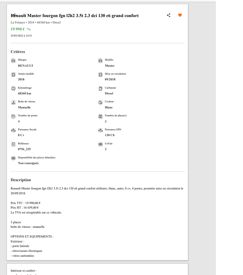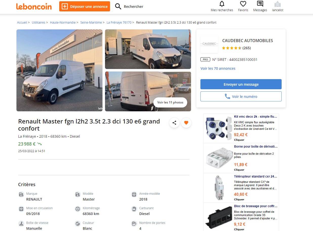 Concessionnaire occasion malhonnête . En effet, je suis allé voir un Renault master L2H2 le samedi 3 avril 2022 affiché a 16 659HT soit 19 990 euros sur les site le bon coin ou la centrale. Ainsi que le petit panonceau sur le par brise du master que j'ai pu voir en arrivant chez eux. Présentation du véhicule, petit tour, parfait. J'allais donné mon accord. Une fois arrivé dans le bureau, offre de prix 24 281,76. Soit 4500 euros de plus que le prix affiché ! Le vendeur, me prétextant que ce ne sont pas eux qui choisissent le prix sur les sites internet Bizarrement, aujourd'hui, en continuant mes recherches je retombes sur le master, prix affiché 19990HT soit 23 988 TTC. Inadmissible de la part d'un concessionnaire. D'autant plus, que la plaque d'immatriculation du véhicule ne correspond pas au véhicule en question
