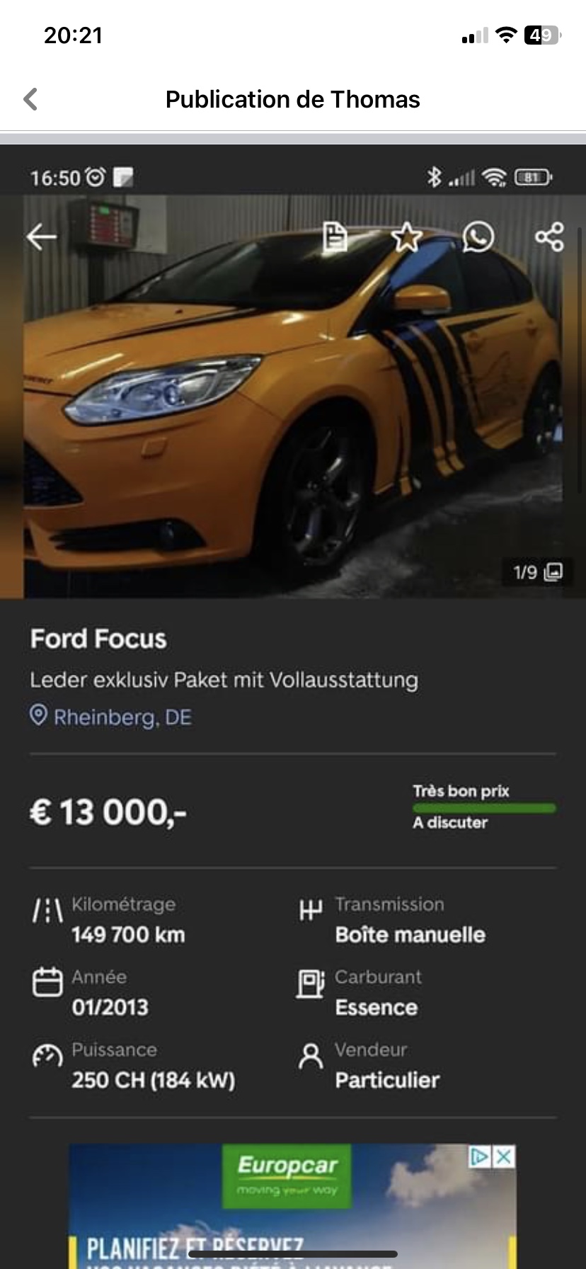 Achat d'une Ford Focus ST fin 2021 (import Allemagne). J'ai pris un risque en achetant la voiture, et jusqu'ici je n'ai heureusement pas eu de problèmes majeurs avec, mais je l'ai quand même récupérée avec une crevaison lente qui aurait pu me bloquer à plus de 100km de chez moi ! Le manque de professionnalisme du vendeur est criant : pas commerçant, ne sait pas ce qu'il vend, ment sur l'optionnage, vous cache que la voiture est modifiée... Bref, à fuir, surtout si vous ne connaissez pas le véhicule que vous achetez ! Attention aussi aux kilométrages modifiés en particulier pour les véhicules importés. Je ne peux que recommander de soumettre la voiture à un contrôle technique volontaire ou une inspection dans un garage de confiance dès la réception du véhicule si vous achetez chez eux malgré tout...