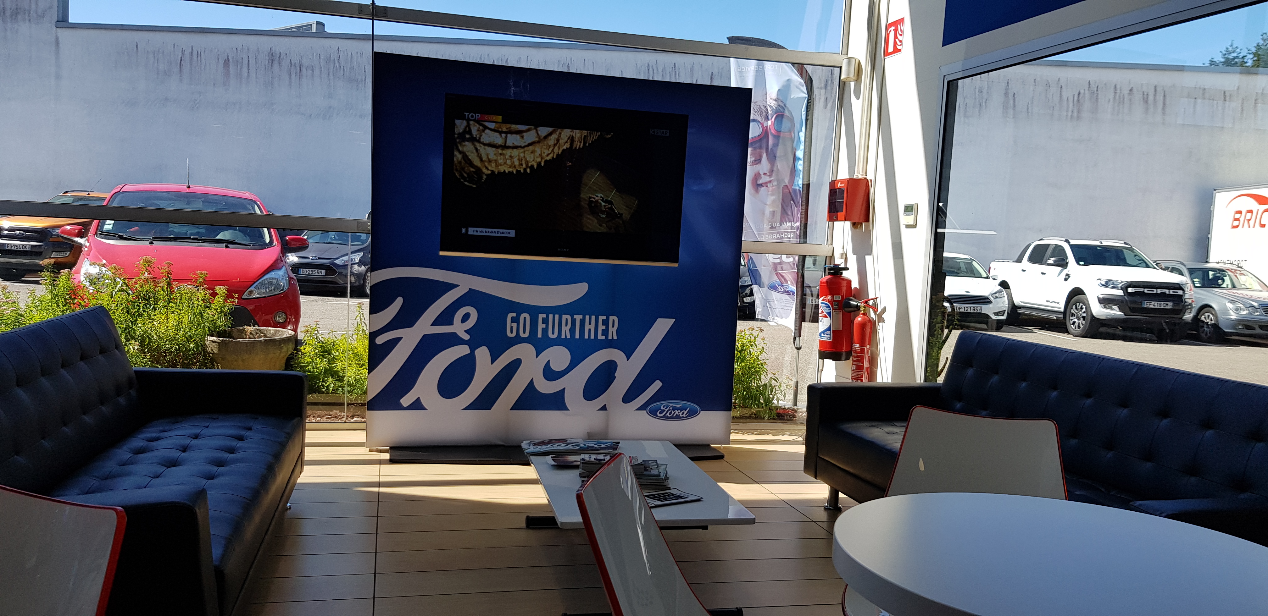 Très bel espace de vente. Quelque peu futuriste. Patienter dans l'espace salon-TV est apprécié. Pour les amoureux des voitures : présence de Mustangs.