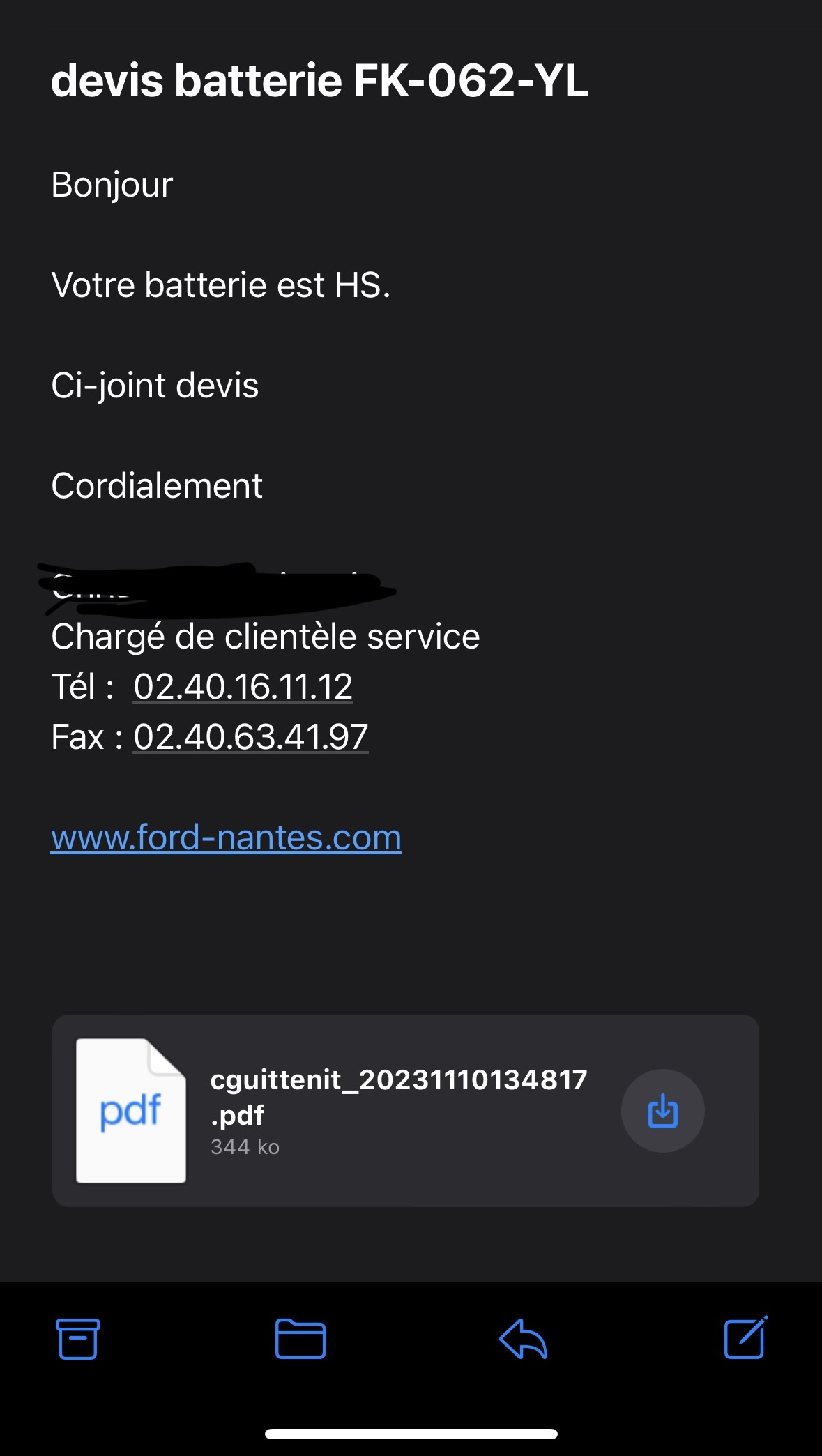 Jean-Francois un vendeur moins que correct bas de caisse du véhicule acheté à 33 000 € hier tout rayé photo à l’appui je m’en suis rendu compte sur la première station de péage venu de Paris mail envoyé deux minutes après pas de réponse de plus le véhicule afficher un défaut ADBLUE ET UN DÉFAUT MOTEUR Un autre mail d’envoyer et toujours pas de réponse réactif avant l’achat plus de réponse après l’achat fuyez cette concession surtout si vous n’êtes pas de Nantes. Je viens de déposer mon véhicule chez Ford suite au problème on m’annonce qu’il y a 3 campagnes de rappel non effectuée la c’est trop franchement je serais de Nantes j’aurais foutu le bordel dans la concession. 😡😡😡😡😡😡😡😡