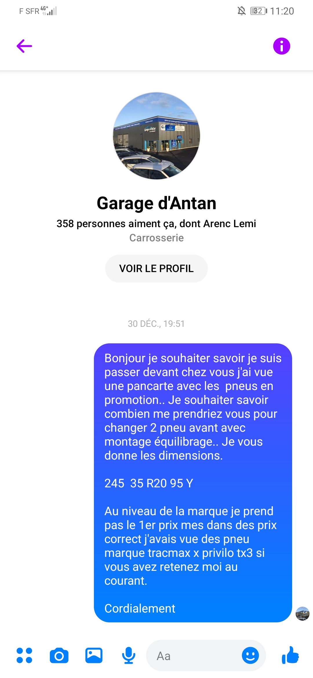 Demande de devis sur leur site Facebook pour des pneus. Après avoir vue mon message aucune réponse et me bloque directement ... Je déranger peut être avant le 31 👍