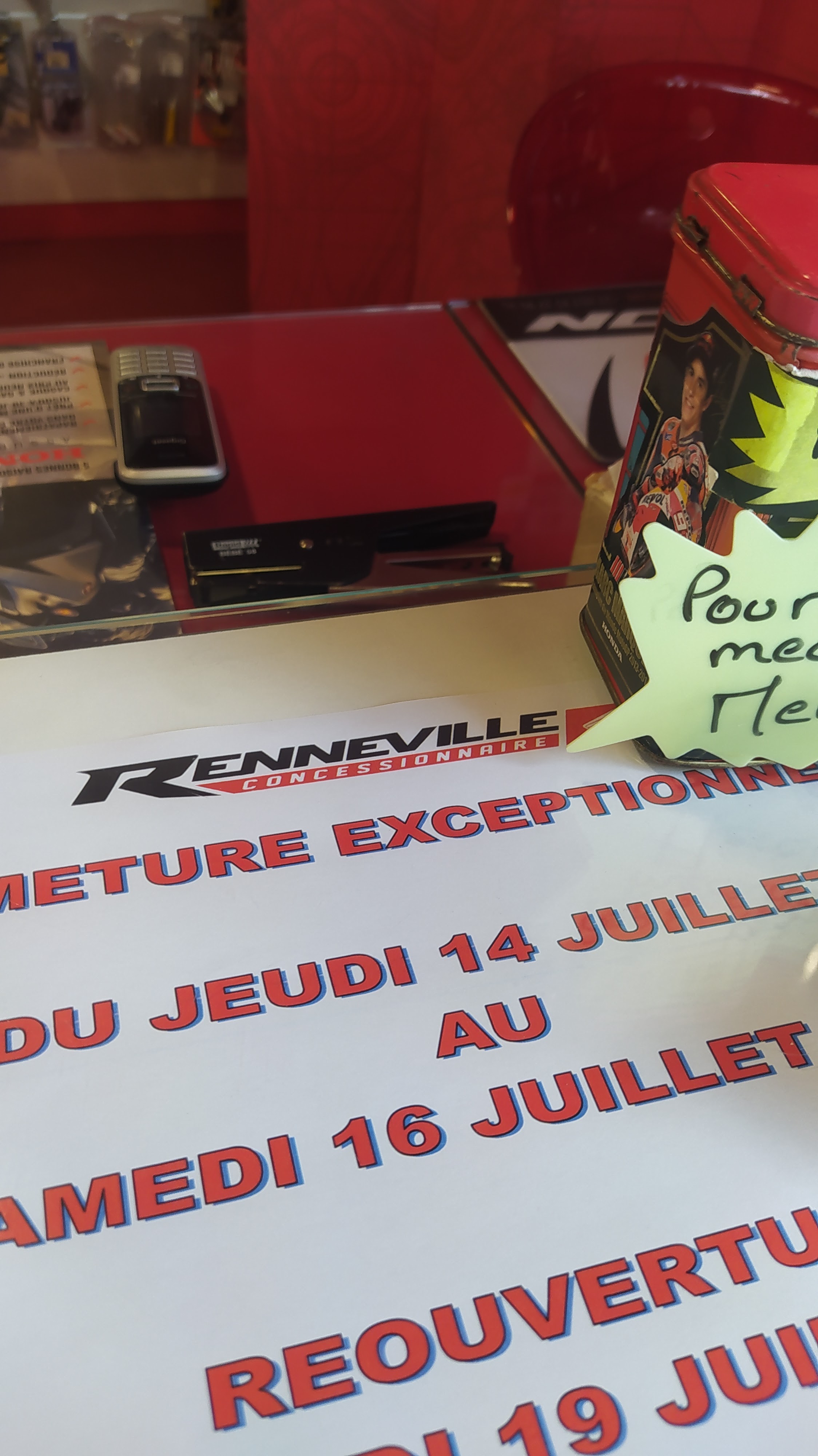 Bonjour , je suis arrivé en dépanneuse à 12h10 alors que c'était l'heure de fermeture de Honda Renneville à villemomble et je remercie l'équipe en place pour m'avoir pris en charge . Je suis arrivé avec une crevaison arriere sur laquelle j'ai essayé de mettre un meche qui etait trop ancienne et qui na pas tenue . J'ai expliqué que j'ai agrandis le trou pour mettre la meche et là on me dit , il faut changé le pneu .Le total de cette opération avec -15% de remise , c'est un pneu facturé 192.27 euros et 84 euros de main d'oeuvre avec un supplément de 9.50 euros de nettoyant . Facture pour un pneu arriere de 285 euros .... J'ai une facture sur un changement de train AV et AR chez Gauvin à Pontault Combault pour le pneu Ar de 158 euros et la main d'oeuvre pour le changement des deux pneus de 65 euros . Plus jamais je ne reviens chez Honda Renneville à Villemomble , des voleurs , car il savent que nos deux roues sont nos taxi . Une honte