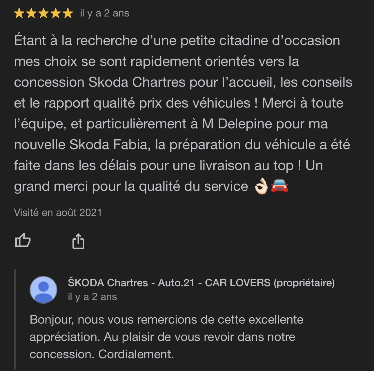 Étant à la recherche d’une petite citadine d’occasion mes choix se sont rapidement orientés vers la concession Skoda Chartres pour l’accueil, les conseils et le rapport qualité prix des véhicules ! Merci à toute l’équipe, et particulièrement à M Delepine pour ma nouvelle Skoda Fabia, la préparation du véhicule a été faite dans les délais pour une livraison au top ! Un grand merci pour la qualité du service 👌🏻🚘
