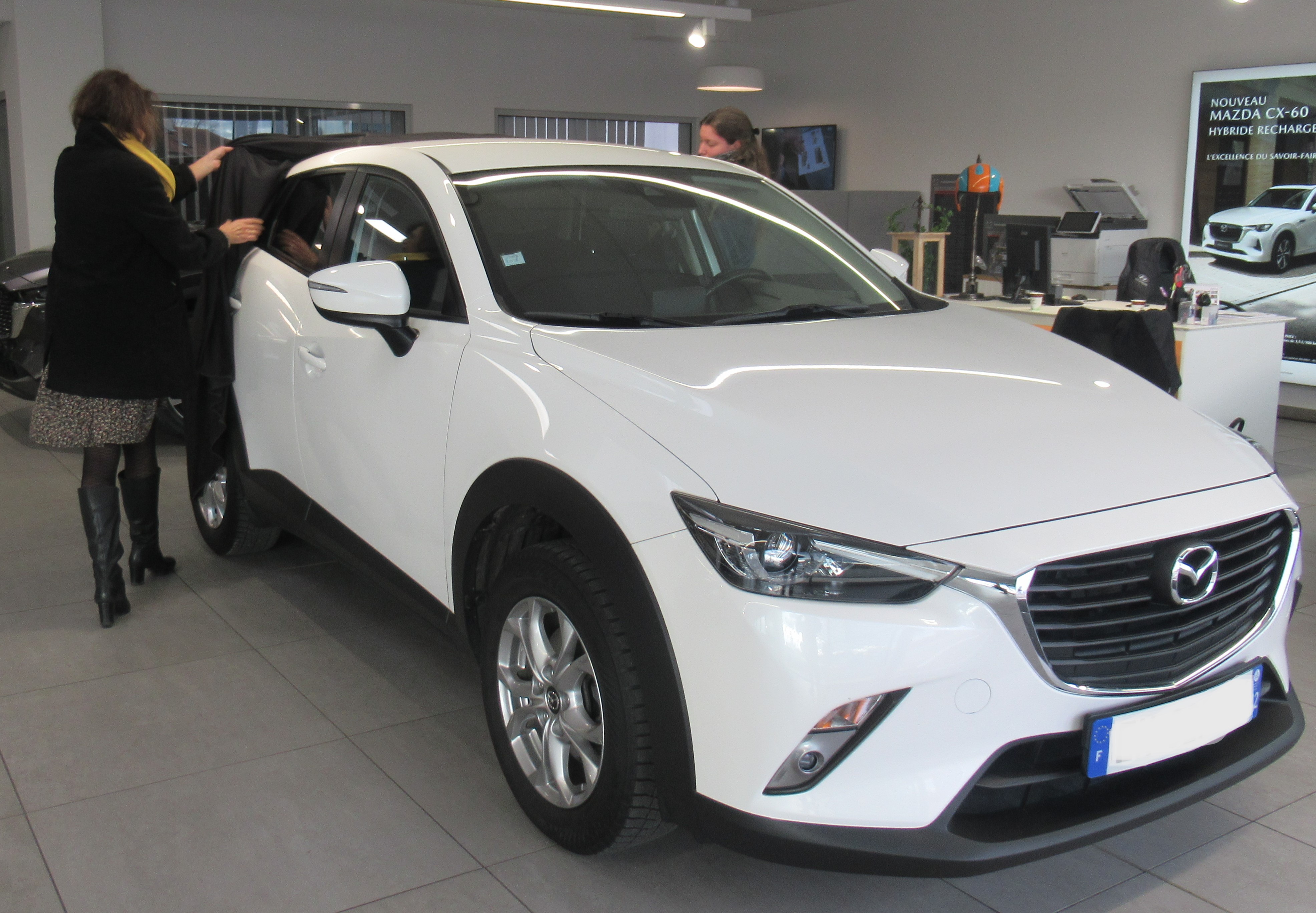 Je suis allé chez dans cette agence pour obtenir des renseignements sur le kilométrage des Hyundai électriques. Mais devant le prix de ces voitures et le kilométrage incertain j'ai préféré ne pas entrer en matière. Alors que j'allais m'en aller je fus interpellé par M. Caruso, pas le chanteur, le directeur de Mazda Roanne. Il me présenta ce qui allait devenir ma nouvelle voiture. Je tombais en amour sous le charme, pas de Caruso mais de ce CX. Et entrepris les démarches afin qu'elle soit mienne, la voiture. Il fallut la paperasse habituelle et la gentillesse de Michel Caruso pour que je lui fournisse les documents souhaités . On ne vit qu'une fois et ça sert à rien de mourir avec du cash sur un compte en banque. Maintenant j'envisage de prendre le modèle sport pour nos week-end en Suisse. Merci Michel !