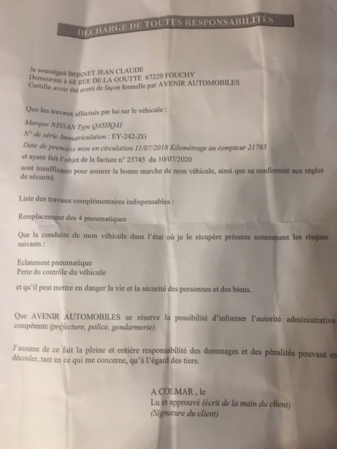 je viens de réaliser la révision de mon QASHQAI chez AVENIR automobiles voila le résultat accueil vers 14H ( rendez-vous pris 15 jours avant) après environ 1heure une dame vient m informer que trois pneus sont à changer je lui donne mon accord pour les changer, celle -ci me répond que ce n est pas possible et me fait signer un document(JOINT) , comme quoi il est dangereux de rouler avec ce véhicule et qu'il se garde le droit de prévenir les autorités de police et administratif et que j assume de ce fait la pleine et entière responsabilité et des pénalités pouvant en découler , tant en ce qui me concerne , qu'à l’égard des tiers, et bien sûr ils mont laissé rentré chez moi avec un véhicule dangereux!!!!!! l c'est quoi ce garage ou sont passés les professionnels !!! s' ils ne corrigent pas leurs manières de faire ÉVITER cet établissement Conclusion : il est difficile de faire confiance à des entreprises de ce type
