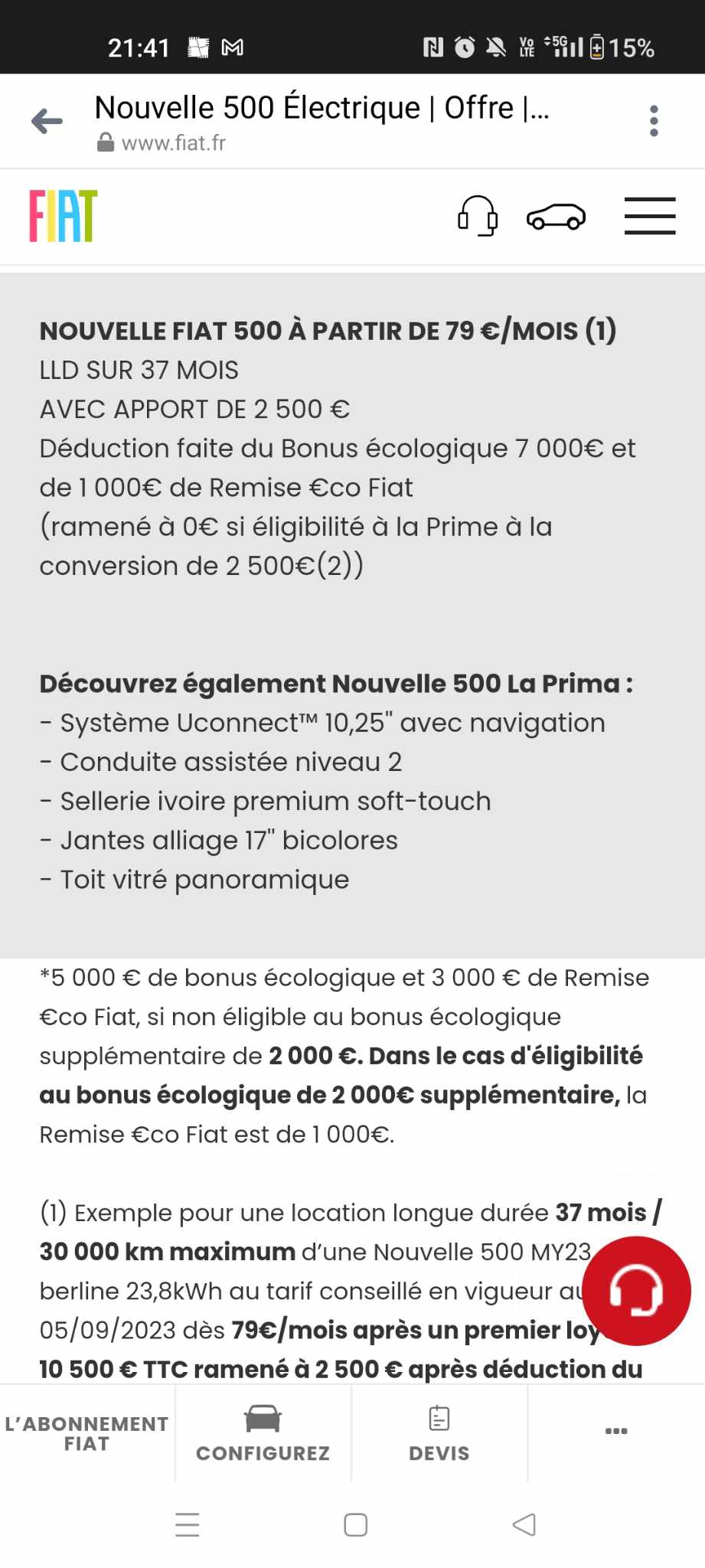 Publicité mensongère fiat 500 électrique 79 euro par mois sur le site et le commercial me sort un baratin de 180 euro par mois, attention sa peu l'arnaque au prix, sachant que la concession participe à cette offre selon son discours
